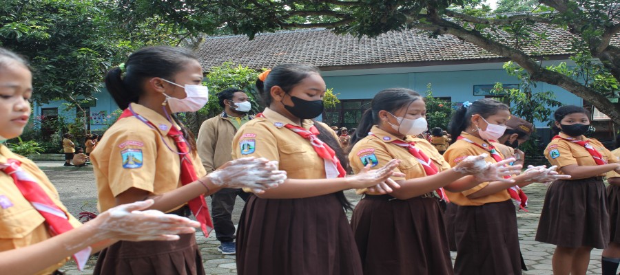 Setelah mendapat arahan, para siswa langsung diarahkan menjadi 3 kelompok dan melingkar untuk melakukan praktik cuci tangan. Pihak puskesmas dan Agen Edukasi WASH membimbing para siswa yang dibagi juga kedalam 3 kelompok tersebut. Para siswa mengikuti praktik cuci tangan dengan seksama mulai langkah 1 sampai langkah ke 6 sesuai intruksi.